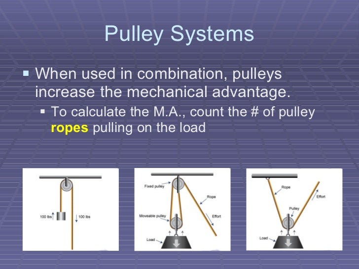 Stem Education - Pulleys from image.slidesharecdn.com That means that a single pulley can provide a 2 to 1 mechanical advantage. The larger the advantage is the easier it will be to lift the weight. Record the effort force value in the table.) calculate the mechanical advantage. For a single pulley that is fixed to the ceiling, we would have an advantage of one. How to calculate mechanical advantage.? The efficiency (e) of a haul system may be calculated by adding the effects of each pulley. Pulleys are one of the simple machines used to apply force on an object, life any load, and transmit power. Start by drawing a simple diagram of the system, then show the pulling force f that the hand applies to the rope.